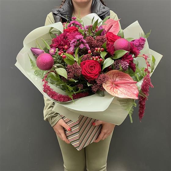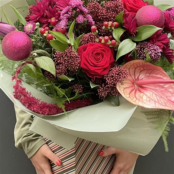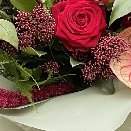 Burgundy Beauty: A rich and warm composition that radiates depth and elegance. This luxurious bouquet feature velvety roses, plush chrysanthemums, and striking anthuriums, creating a bold interplay of texture and colour. accented with lush seasonal blooms and foliage, this is perfect for making a dramatic, heartfelt statement.