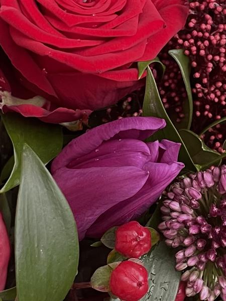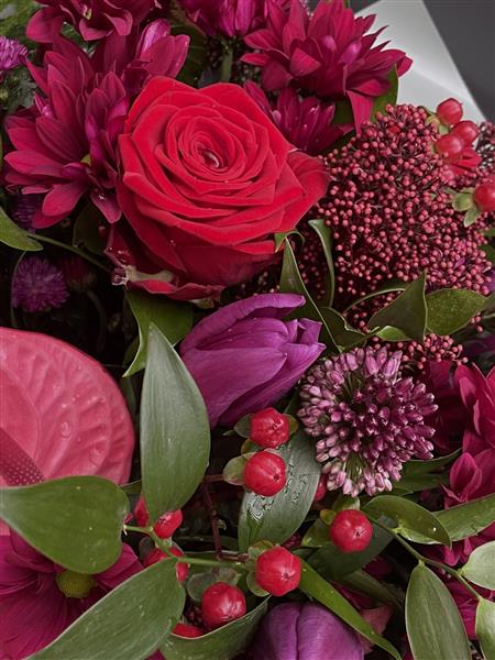 Burgundy Love: An exquisite blend of rich and warm textures that radiates luxury and elegance. This striking bouquet features velvety roses, plush chrysanthemums, and striking anthuriums, creating a bold interplay of texture and colour. accented with stunning seasonal blooms and foliage, this is perfect for making a dramatic, heartfelt statement, an anniversary, birthday celebrations or just simply to brighten someones day.