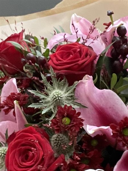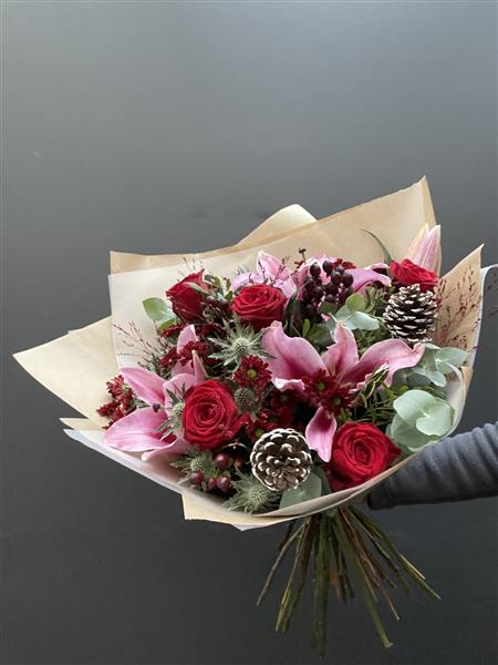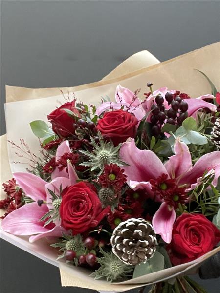 Crimson Luxe Bouquet is just that with striking velvet red roses and sweet scented pink oriental lily, accompanied by deep seasonal accent flowers, oozing richness and elegance with deep textures. This is a beautiful bouquet for winter birthdays, celebrations or just simply because.