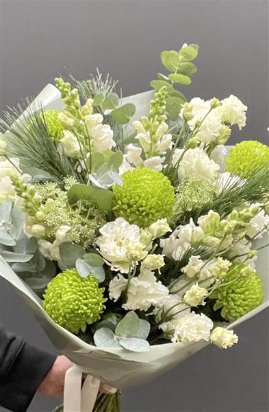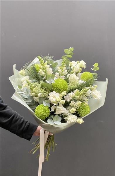 Celebrate the season with our Yuletide Classic Bouquet, a timeless hand tie featuring lush green blooms and festive white florals. Designed to evoke the charm of winter celebrations, this bouquet blends fresh textures and soft, snowy tones, bringing warmth and elegance to any holiday setting.